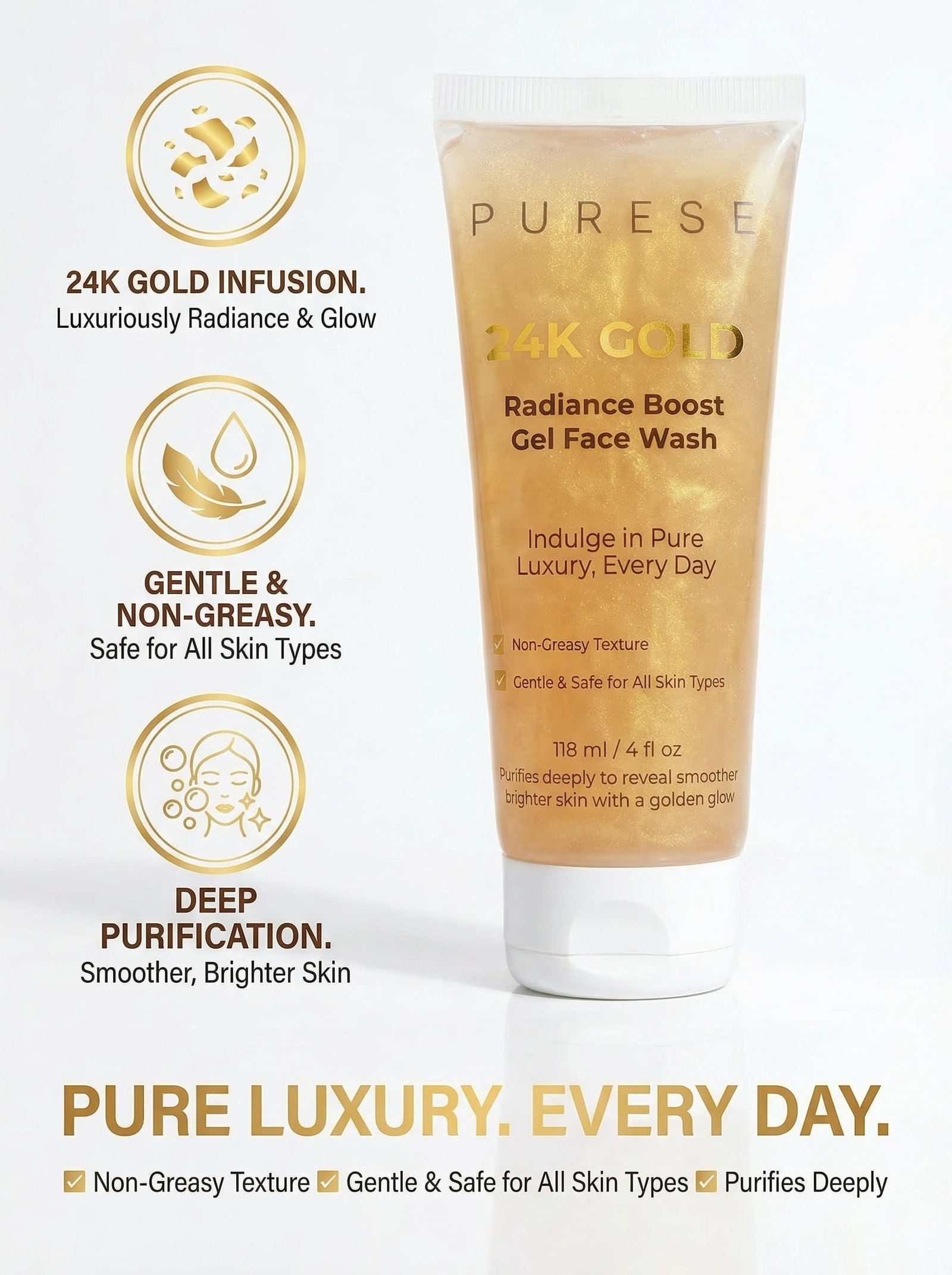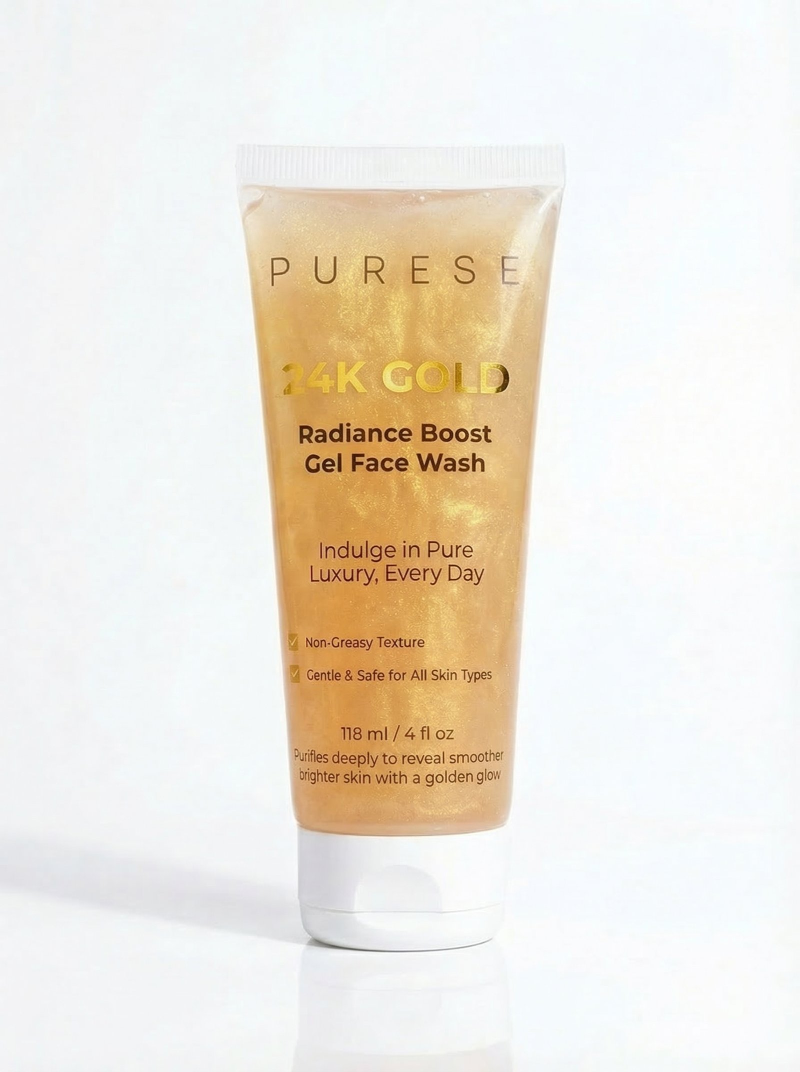 Purese 24K Gold Face Wash is a luxury facial cleanser infused with 24K gold particles that gently cleanses, brightens, and enhances the skin’s natural glow.