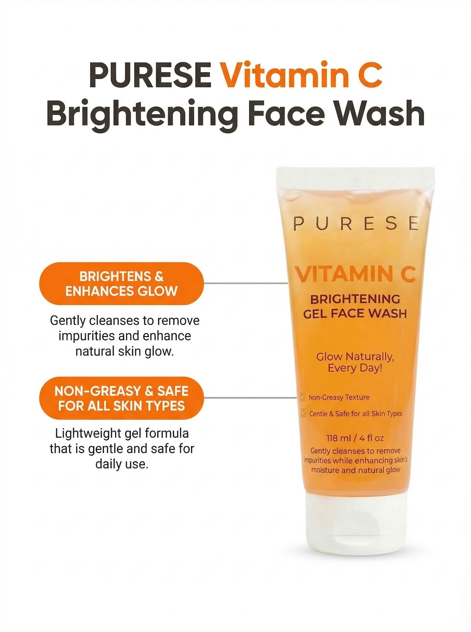 Purese Vitamin C Face Wash is a brightening facial cleanser enriched with Vitamin C that helps cleanse skin, improve radiance, and promote an even, healthy-looking complexion.